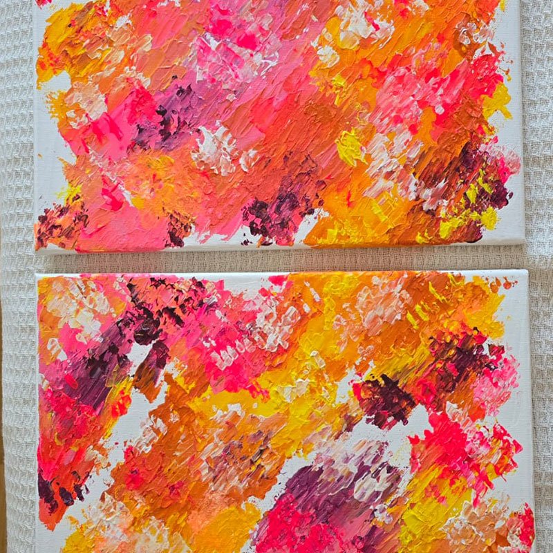 Exploding with warmth and texture, “Sunburst Bloom” captures the energy of a fiery sky. This impasto-style canvas set is created with thick, expressive strokes of pink, orange, yellow, and violet. A bold choice for adding life to neutral walls.